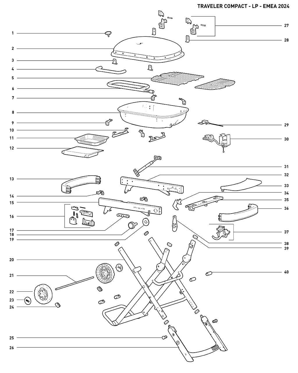 De Weber Traveler Compact is een draagbare gasbarbecue die perfect is voor wie graag overal wil grillen — van camping tot picknick, terras of vakantie. Dit compacte model combineert Weber-kwaliteit met gebruiksgemak, snelle opwarming en een gelijkmatige warmteverdeling, zodat je moeiteloos sappige steaks, groenten en vis bereidt. Door het lichte en praktische ontwerp neem je de Traveler Compact eenvoudig mee onderweg. Bij BBQ Parts Europe vind je een uitgebreid assortiment originele Weber Traveler Compact onderdelen en accessoires, zoals grillroosters, gasregelaars, branders en ontstekingsonderdelen. Door tijdig onderdelen te vervangen, blijft je barbecue veilig en optimaal presteren. Bestel eenvoudig online bij BBQ Parts Europe en geniet overal van Weber-kwaliteit.