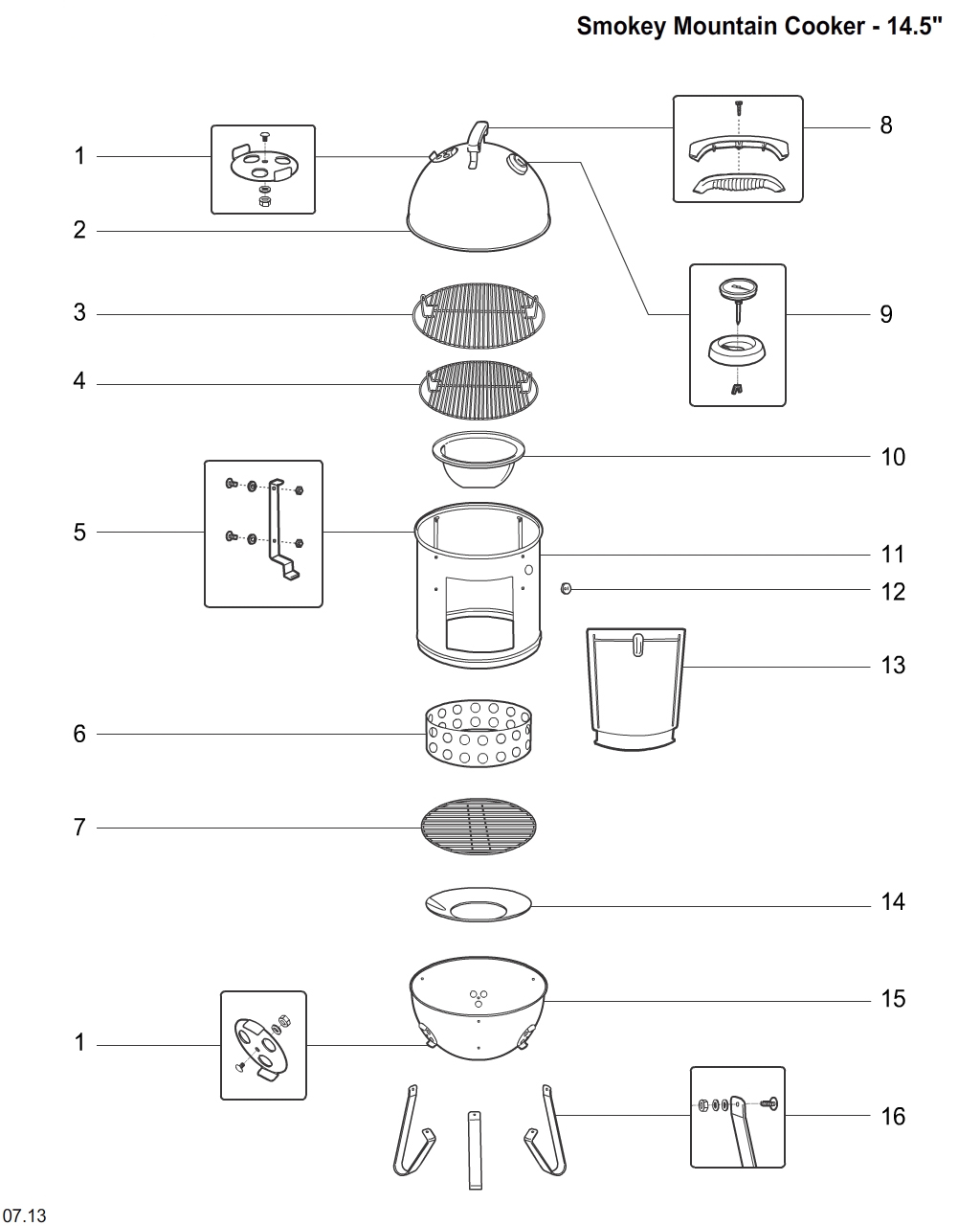 85035 Door assembly, 14.5″ 37cm SMC Door Smokey Mountain Cooker nummer 13 op schematekening.